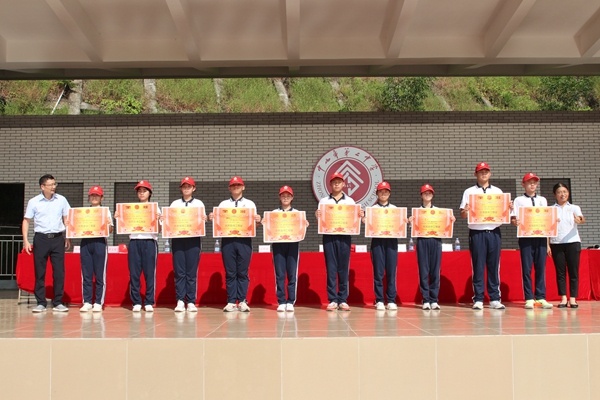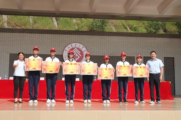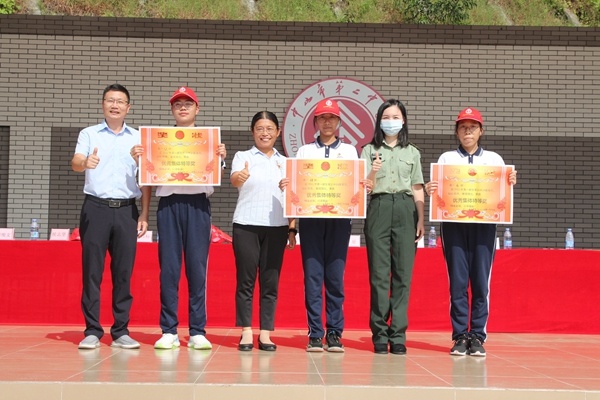 高一5班的學生代表呂珉熹同學發(fā)言。從意志品質、團隊精神、感恩懷德和使命擔當四個方面講述了軍訓的收獲,表達了自己的態(tài)度與志向。在這短短幾天,二中學子實現(xiàn)了意志品質的跨越與蛻變,涌現(xiàn)出一大批刻苦訓練、紀律嚴明、內務嚴整、精神飽滿的先進個人和優(yōu)秀集體。在頒獎儀式上,羅玉瓊副主任宣讀表彰決定,領導嘉賓們?yōu)楂@獎同學頒獎。