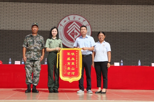 同學們取得的榮譽離不開教官的引領和付出,學校為優(yōu)秀教官們頒獎?!拌F血震山河,軍威育英才”,為表示對教官的感謝,吳祥明校長、梁紅妹副校長向承訓方贈送錦旗。