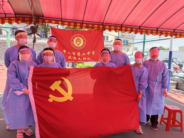 接到雙聯雙助支援任務后,中山二中黨委快速行動、科學統籌,立即招募中山二中黨委委員、副校長王曙東在內的16名教師志愿者組成抗疫黨員突擊隊,全力支援黃圃鎮鰲山村核酸檢測工作。值得一提的是陳潤麟副主任、廖淑清、蔡偉鑾、梁銀鈴等老師也發動家人當起志愿者,投入到核酸檢測工作中。