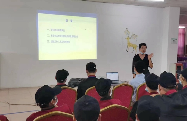 然后,劉紹琴校醫以疫情防控專業知識為抓手,緊密結合食堂工作實際和實踐案例,深入淺出講解了標準洗手、通風、消毒以及人員排查、隔離、核酸檢測、冷鏈食品管控等一系列防控知識,明確了防控重點和具體措施,同時還對突發公共衛生事件應急處置知識進行了講解。