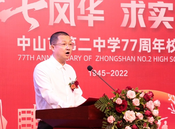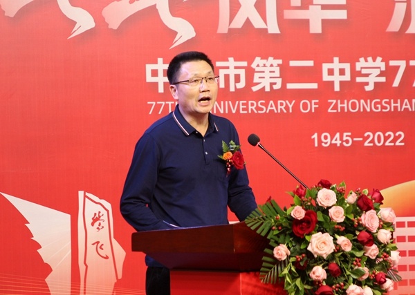 中山市第二中學老校長黃棣棠致辭。他說,中山二中與中山職中和中山市農業技術中學等是一脈相承的,它是我們中山市歷史悠久,具有光榮傳統的一間名校,也是培養人才的搖籃。今日應牢記習近平總書記的殷切教導:踔厲奮發,砥礪前行,篤行不怠。使我們中山二中今后有長足的發展,創造更大更多的輝煌。