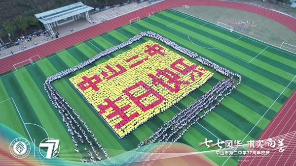 慶典第三章程,啟航。在校教職工與青春活潑的學子們送上最真的祝福。歷年優秀藝術節目如一顆顆璀璨的明珠,指引同學們永不止步。青春在中山二中發光發亮,舞動飛揚,全體二中學子們在操場排出對中山二中的美好祝福:1945,2022,77年,七七風華,求實向善,中山二中,生日快樂!