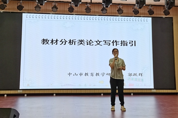 第一環節,中山市教育教學研究室初中語文教研員郭躍輝給老師們開展了主題為《教材分析類論文寫作指引》的講座。