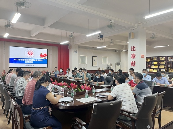校黨委書記、校長吳祥明,副校長王曙東,分管防疫工作副校長侯志堅,衛生副校長、中山市疾控中心免疫規劃所副所長呂海英,黃圃鎮疾控中心陳逸龐醫生和吳鶴齡醫生,以及學校全體行政、心理科組、校醫室全員和食堂經理、物業經理等關鍵崗位人員參與了演練。侯志堅副校長擔任應急演練總指揮并主持桌面演練。
