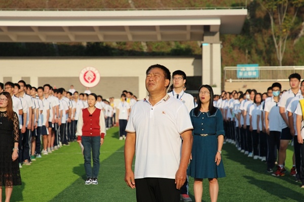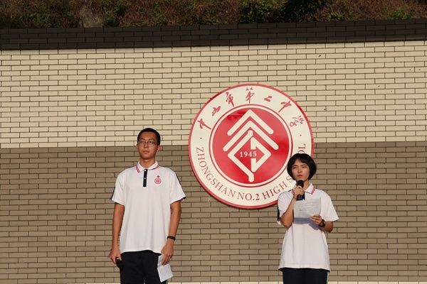 11月14日清晨,中山二中于體育場開展本周升旗儀式,國旗班同學手持國旗,列隊進場。鮮紅的國旗,伴隨著雄壯的國歌聲,升旗儀式莊嚴而神圣。高三9班兩位同學作《七七風華,求實向善!熱烈祝賀中山市第二中學77周年校慶》的國旗下演講。