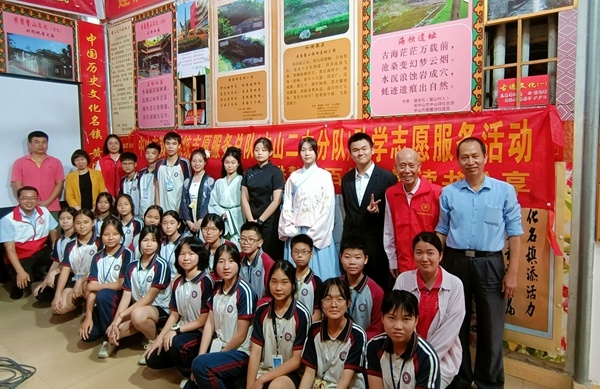 首先,潘添元老師帶領我們參觀了百年書屋,有文化廊、讀書樂園、詩聯樓、書香苑、書畫園和生活花地。他向我們介紹了百年書屋的建設歷史,并分享自己的人生故事,潘老師87歲高齡,但精神矍鑠,和藹可親。接著,黃圃鎮關工委常務副主任譚鏡煒向我們講解了鰲山村的悠久歷史,并分享了他和百年書屋主人的交往故事,即興給我們朗誦了潘添元老師的代表詩作和他自己的詩作,聲情并茂,深深吸引了在場的師生。他帶領師生一起吟唱《黃圃贊歌》,將整個分享環節推到高潮,最后他還采用讓學生搶答的形式贈送黃圃明信片。 讀書分享展示環節在書畫園進行,由二中五名學生志愿者和劉禮娜老師分享四大名著。