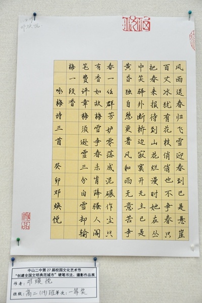 隨著學校擴改建工程順利完成,教書育人環境持續優化,中山二中美術科組老師力求讓新美術館發揮展示與交流、教育與傳播的功能,努力提高學生的審美水平和學校認同感。在這個萬物復蘇、春暖花開的季節,我們迎來了中山市第二中學第27屆校園文化藝術節攝影、硬筆書法作品展覽。