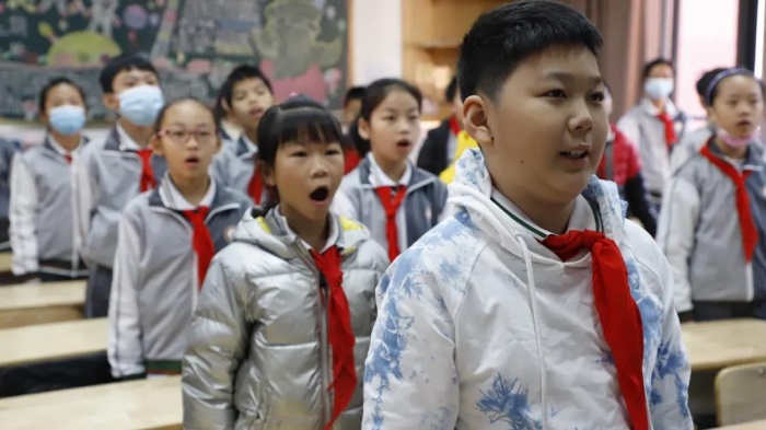 首先,跟隨著直播舉行莊嚴的升旗儀式。接著,全校師生進行“憲法晨讀”,大家精神飽滿,情緒激昂,用聲音訴說對憲法的尊重,用心體會憲法的莊嚴與神圣。隨后,師生跟隨直播同唱歌曲《憲法伴我們成長》,觀看優秀展演,在節目中進一步理解憲法精神,學習憲法知識,提高自我保護防范意識。