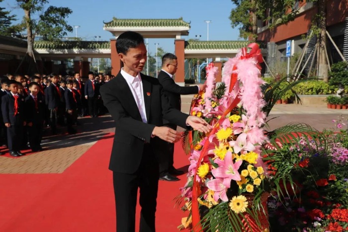 面對孫中山先生銅像,全體師生肅然而立,4名男教師抬起花籃,21名少先隊員手捧鮮花,緩步走向孫中山先生銅像前,代表紀小全體師生、家長代表敬獻花籃、鮮花。謝志斌校長、家委會副會長席鵬先生上前整理花籃緞帶。紀小領導班子、家委會代表在孫中山先生銅像緩緩繞行一周后,全體師生、家長代表一起向孫中山銅像三鞠躬,表達對孫中山先生的敬意與懷念。