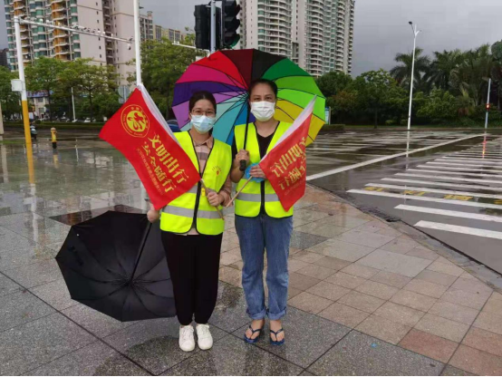 同月,為提高黨員服務群眾的意識,落實學黨史,辦實事,7月20日,中山紀念小學黨支部組織黨員教師在德能東路、港義路路口開展交通勸導志愿服務工作。志愿者們冒雨進行交通勸導工作,在暴雨紅色、臺風黃色預警的情況下,仍然堅持在交通引導崗位,協助路口的交通疏導,全心全意為群眾服務,將黨史學習教育走深走實,為2021年暑假創文志愿服務活動貢獻自己的力量。