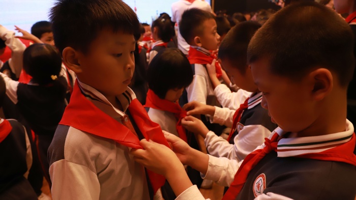 隨后,少先隊大隊輔導員陳杰貞老師宣讀新隊員名單,老隊員為新隊員授紅領巾。每位新隊員精神飽滿,臉上洋溢著自信、自豪的笑容,在全體師生的見證下成為了一名光榮的少先隊員。同時,新加入學校的三1、四1、五1中隊的中隊長接過鮮艷的中隊旗,也接過了一份的責任。