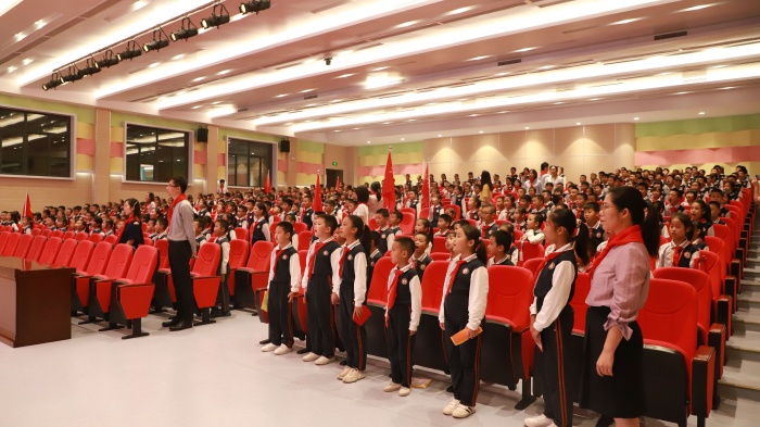 “請全體起立,立正,出隊旗,少先隊員敬隊禮。”在指令中,隊員們用堅定的目光注視著鮮艷的隊旗,全體肅立。緊接著,全體合唱《中國少年先鋒隊隊歌》,嘹亮的歌聲表達出少先隊員的自豪。