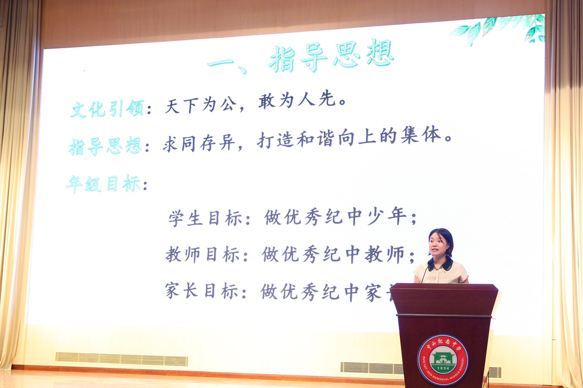 初一黃紅主任述職中指出,初一年級在紀中文化的引領下確定了年級的指導思想——求同存異,打造和諧向上的集體;年級目標——學生目標:做優秀紀中少年;教師目標:做優秀紀中教師;家長目標:做優秀紀中家長。以“適應”和“自律”作為實現目標的階梯式德育工作關鍵詞。初一年級德育團隊已從青澀走向成熟,并呈現出“和而不同、全員育人、自主創新、深耕細作”的特點。