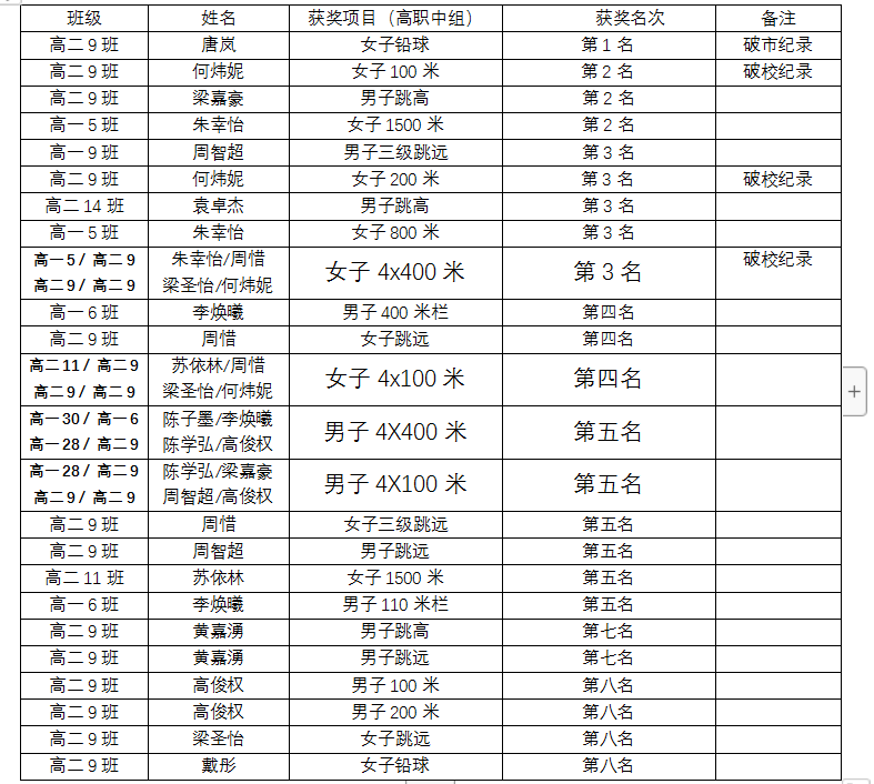 我校田徑隊本次派出了8男7女共15名運動員參賽,獲得1項冠軍、3項亞軍、5項季軍,以團體總分117分獲得該項賽事高職中組團體總分第四名(高職中組共17個代表隊),其中唐嵐同學以10.42米成績獲得女子高中鉛球冠軍并打破中山市該項目最高紀錄,梁嘉豪獲得男子跳高亞軍,何煒妮獲得女子百米飛人大戰(zhàn)亞軍并創(chuàng)造我校女子百米新紀錄,朱幸怡則在女子1500米比賽中拼得亞軍,周智超獲得男子三級跳遠獲得季軍,袁卓杰獲得男子跳高季軍,朱幸怡獲得女子800米季軍,何煒妮獲得女子200米季軍并創(chuàng)造僑中女子該項目紀錄,由朱幸怡、何煒妮、周惜、梁圣怡四位女生組成的接力隊獲得女子4x400米季軍并打破我校該項目紀錄。參賽的15名運動員均在各自參加的24個項目里獲得了前八名以上成績,非常難得。另外,我校還以最高得票數(shù)獲得該次比賽的“體育道德風尚獎”(共41個單位參評,由各代表隊投票選出,得票最高的前七名獲獎)彰顯了我校優(yōu)秀的體育道德風貌,獲得兄弟學校的高度認可!本次比賽由林杰老師和楊輝東老師帶隊,祝賀他們!