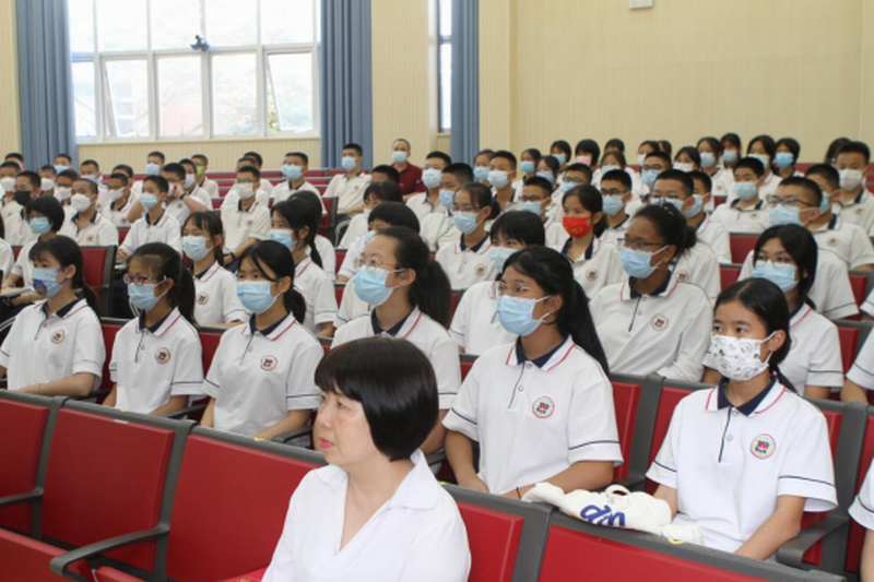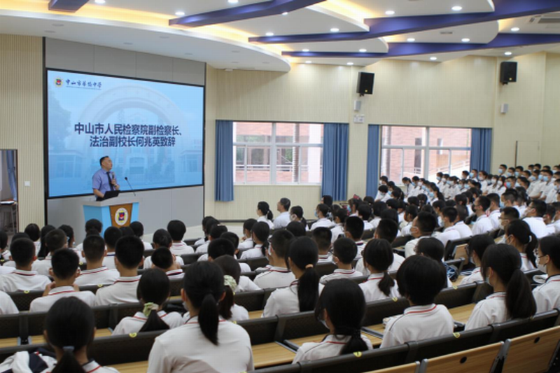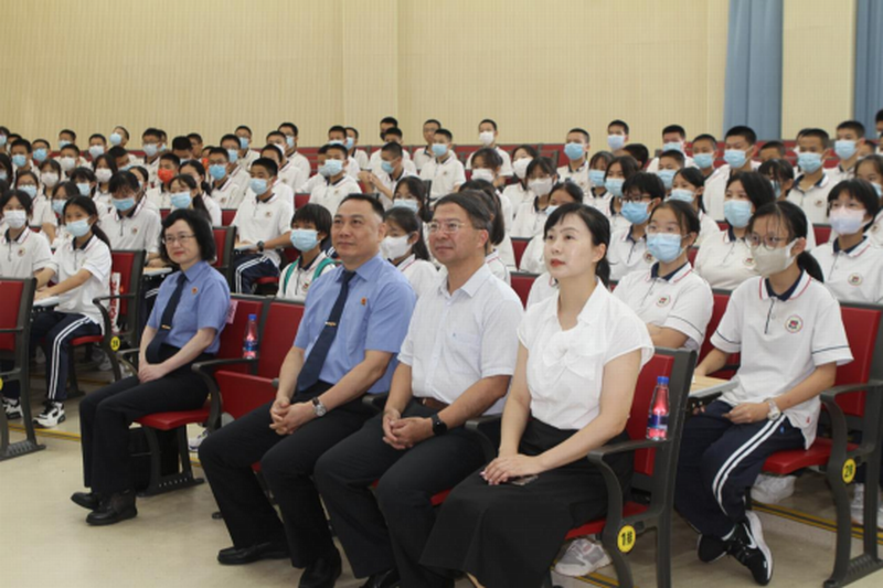 中山市人民檢察院副檢察長(zhǎng)何兆英,我校黨委書(shū)記、校長(zhǎng)高毅,中山市人民檢察院四級(jí)高級(jí)檢察官徐華玲,我校黨委委員、副校長(zhǎng)徐璇,德育處副主任兼初一年級(jí)主任丁福楷,初一年級(jí)德育主任吳成應(yīng),校團(tuán)委副書(shū)記王曉軒,以及初一年級(jí)部分學(xué)生參加了活動(dòng)。活動(dòng)同時(shí)開(kāi)通了線(xiàn)上直播,初一年級(jí)其余各班學(xué)生在教室線(xiàn)上觀(guān)看。