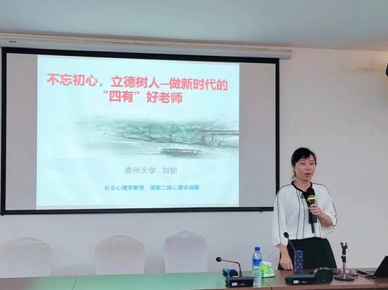 開班第一課,貴州大學社會心理學教授劉郁以心理學視角、從“何為人的初心”及“何為教師的初心”入手,對“教師”、“師德”、“師風”進行了生動的解讀,并結合具體案例分析了造成教師情緒困境的原因及影響因素,為教師緩解壓力與心理調適提出了切實可行的方法和建議,幫助大家更好地調整自身狀態,更從容地面對教育教學工作。