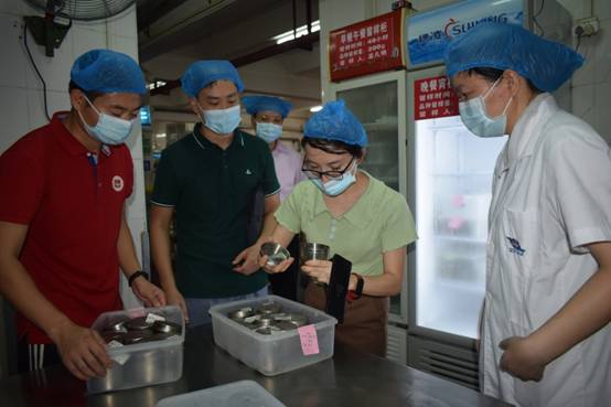 譚科長一行重點查看了校園整體環境及飯堂、校醫室等,聽取我校領導關于開學準備工作的相關匯報,深入了解學校疫情防控、食品衛生等方面的工作。在檢查學校飯堂情況時,譚科長一行重點檢查了飯堂后廚、庫房、留樣柜等;查驗了貨源;查看消毒餐具的存放是否合規,糧、油、調料的品牌和生產日期,食材肉類新鮮程度以及食堂從業人員的健康證等。