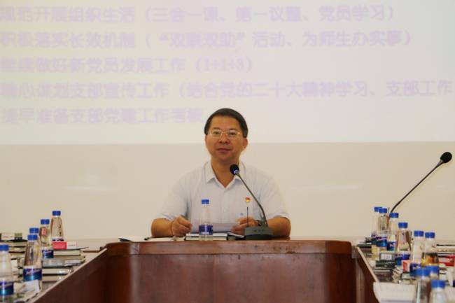 隨后,校黨委委員、紀委書記、黨辦主任彭海泉回顧總結了我校2021年紀委工作情況,并對新學期紀委工作進行了安排部署。彭主任還總結了我校2022年第二季度意識形態工作情況,從加強師生安全、疫情防控等方面對2022年第三季度意識形態工作進行了部署,重點講解了新學期學校黨建工作安排,要求各支部繼續用好“學習強國”等平臺抓好理論學習,規范開展黨組織生活,積極落實“雙聯雙動”、為群眾辦實事等長效機制,做好發展黨員及支部宣傳工作等。