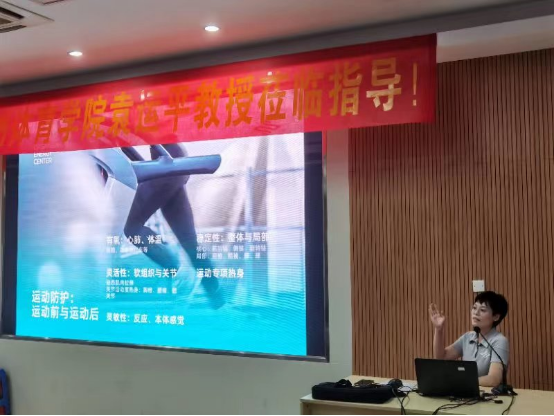 本次研討活動由我校體育科組劉勇老師主持,共分為理論講座和教學實踐兩部分。袁運平教授在學術報告廳開展了關于“體適能”訓練的講座,袁教授通過自身在國家隊帶體能訓練的經驗為大家講述了為什么要進行體能訓練、練什么、怎么練,用先進的理念說明體適能訓練的重要性,并結合具體的運動案例講述了現代體能訓練的新方法。
