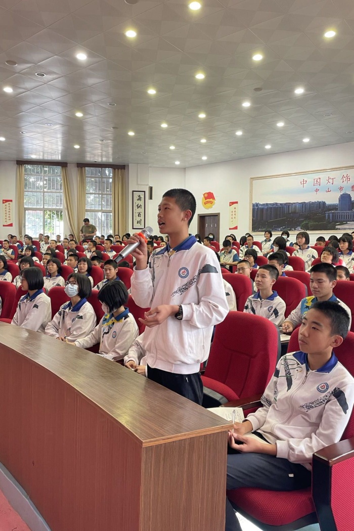 根據《中山市“紅領巾獎章”實施方案》的內容,為聚焦少先隊政治啟蒙和價值觀塑造主責主業,突出黨團隊的血脈關系和紅色基因傳承,不斷加深少先隊員對少先隊組織和標志標識內涵的認識和理解,增強少先隊員光榮感,中山市曹步初級中學積極舉行2022年紅領巾爭章啟動儀式并開展“弘揚雷鋒精神,砥礪奮斗青春”的主題班會活動。周振祥、鄭雯靜同學作為中山市優秀少先隊員在國旗下發表演講,陳凡老師分別于2022年3月14日、15日、16日在報告廳給三個年級的學生開展主題班會活動。林詩琪老師擔任活動主持人。
