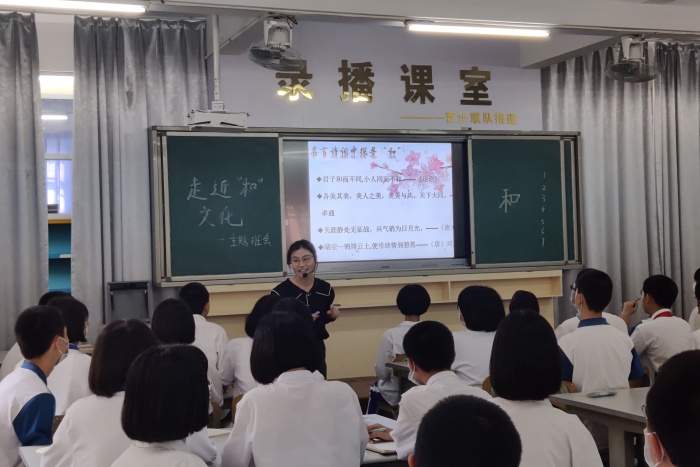 接著,林詩琪老師帶領初二(6)班學生進行授課。她先從“和”“諧”的字面意思出發走進“和”文化。學生從正反兩面思考問題,體會到“和諧”就是關心、團結、幫助、尊重與信任人,講究有愛,學生從正反兩面思考問題,體會到“和諧”就是關心、團結、幫助、尊重與信任人,講究有愛,不議人非,不揭人短,不言人過。學生的情境表演,生動有趣。林老師語言飽含激情,評價適時恰當,善于發現學生亮點。