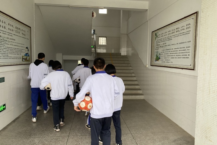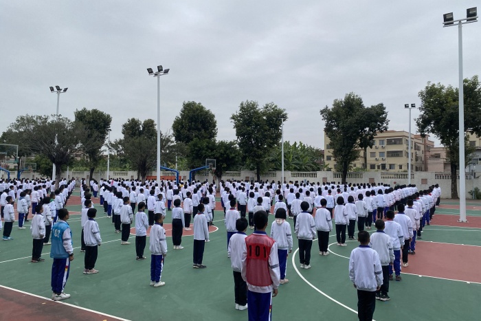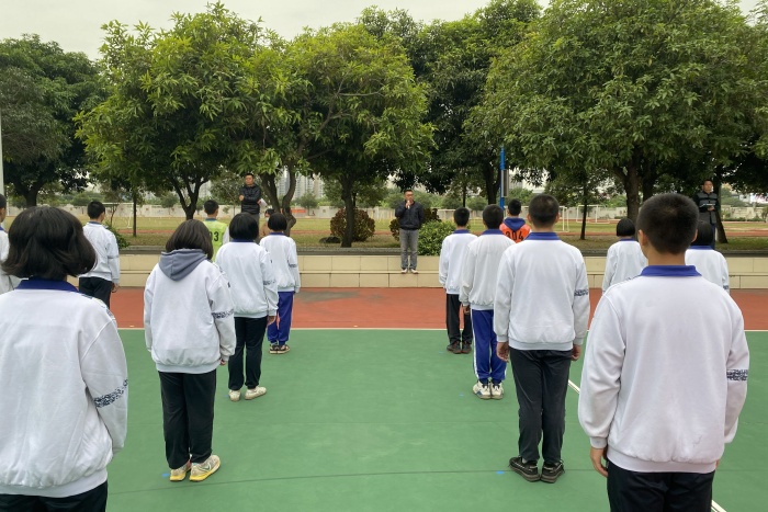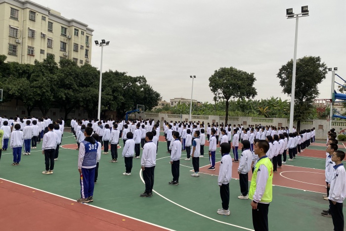 隨后,進(jìn)行的是初一初二年級(jí)升旗儀式進(jìn)退場活動(dòng)。只見初一初二年級(jí)的同學(xué)精神高漲、口號(hào)整齊地向籃球場跑來,途中遇到老師時(shí)高呼“老師好!”。最后,同學(xué)們有組織有紀(jì)律地演練了去音樂室、美術(shù)室、電腦室等相關(guān)場室上課的隊(duì)型隊(duì)列。