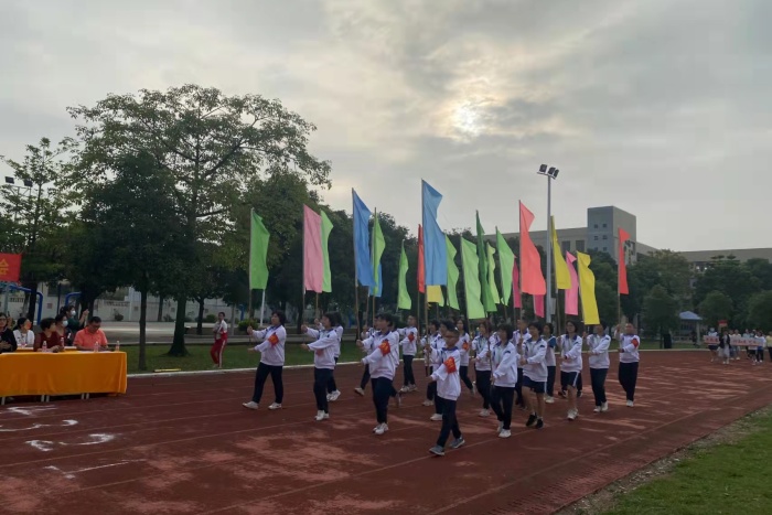 伴隨著歡快、昂揚的運動員進行曲,國旗隊、彩旗方陣以及各班運動員方陣依次有序入場。每個方陣以統一的服飾、矯健的步伐、飽滿的精神、響亮的口號進入田徑場,彰顯了師生積極向上的精神風貌,也展示了一班一特色的風采,更贏得了各位嘉賓及現場觀眾持久而熱烈的掌聲。進場完畢,全體成員一起升國旗,奏唱國歌。緊接著由張幸琪同學帶領同學們做手語操《國家》,由王境杭同學帶領同學們宣誓。