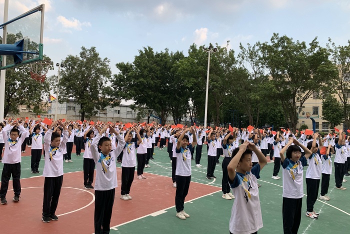 接著,全校師生揮舞著手中的紅旗,齊唱《歌唱祖國》,共同歌頌偉大祖國成立71周年取得的輝煌業績和偉大成就。全校師生表演了隊形變字,隊形中“國慶71周年”六個大字,為祖國祝福,抒發了對祖國母親強烈的熱愛之情。