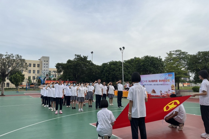 喜迎黨的二十大,結合慶祝中國共青團成立100周年,不斷深化學習貫徹習近平新時代中國特色社會主義思想,用黨的創新理論武裝全團。2022年5月30日,由古鎮鎮團委、少工委、中山市曹步初級中學黨委、團委、少工委承辦的“喜迎二十大 永遠跟黨走 奮進新征程”——古鎮鎮少先隊員離隊、入團儀式暨14歲集體生日活動于曹步初級中學舉行。鎮團委書記曹嘉銘、鎮教體中心廖秋菊、曹步中學校長年四揚、鎮團委副書記張慧慧、曹中副校長吳文杰、曹中德育主任鄧妃弟、曹步中學團委書記詹廣權、古鎮中學團委書記嚴海英、海洲中學團委書記袁錦釗、光正學校團委書記區根成出席活動。