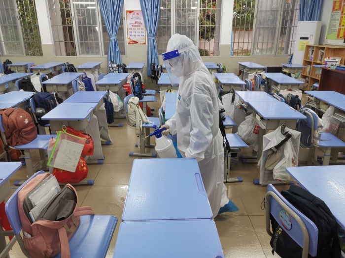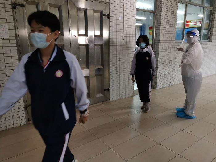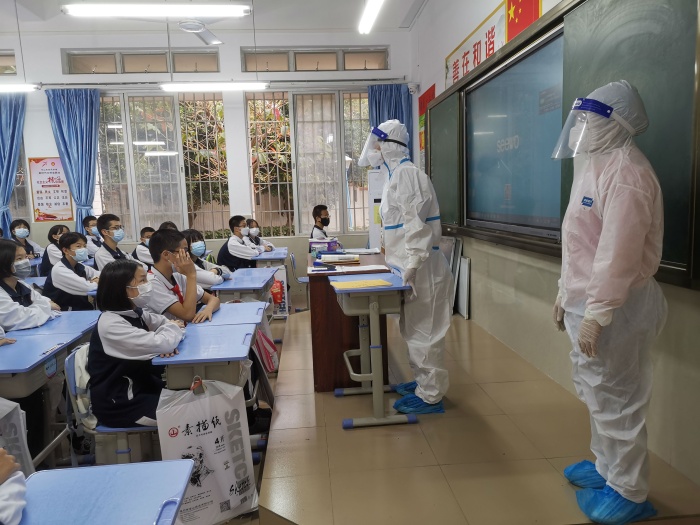 模擬演練分為:1、學校劉喜全校長接到衛生部門通知,何婷(化名)為新冠肺炎病例的密切接觸者。2、劉喜全校長聯系蔣燕梅副校長確認何婷為初一(18)班學生。3、學校立即協助“三人小組”轉運學生何婷;同時啟動校園封閉管理,嚴格控制外來人員、車輛進入校園;溫永誼副校長廣播通知全校教職員工和學生做好個人防護。4、劉喜全校長向主管部門報告初步信息及準備啟動應急響應。5、蔣燕梅副校長等信息聯絡組人員組織收集何婷的密接人員名單,報告應急領導組。6、學校啟動疫情應急響應:部署各部門工作;做好師生的心理健康的教育與心理疏導;微信群發送《給家長的一封信》把情況告知家長;7、相關部門到校處置:重點場所消毒;開展核酸檢測工作。8、劉喜全校長做進程報告等8個情景。