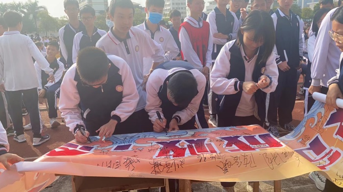 會議最后一個環(huán)節(jié)是全體初三學(xué)生圓夢勵志簽名。在勵志背景音樂中,各班學(xué)生飽含熱情,紛紛來到隊伍前面,在彰顯各班中考斗志和士氣的橫幅上簽上自己神圣的名字和奮斗的目標(biāo)學(xué)校。從學(xué)生臉上洋溢的笑容中可以感受到大家奮戰(zhàn)百日的信心和決心。