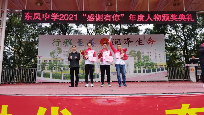 接下來的是頒發兩大獎項。首先是“東鳳中學2021‘感謝有你’年度人物頒獎”,經過學校各部門的推薦、學校行政會議的反復討論、商議,最終評選出8個2021“感謝有你”年度人物。他們分別是:默默耕耘、無私奉獻的退休數學教師黃潔珍老師;團結、拼搏、奮進的體育科組團隊;艱苦訓練、團結拼搏的法律知識競賽團隊;克服種種困難,21年一直堅守在班主任崗位上的數學科組長陳德忠老師;經驗豐富的最美導師、先進教學理念的踐行者、學生心目中的知心人的惠文偉老師;榮獲中山市優秀教師、中山市創新實驗競賽一等獎的榮譽的年輕班主任鄧海鵬老師;榮獲廣東省美術教師基本功大賽二等獎的時尚美麗、多才多藝、爽朗睿智的90后梁琴老師;身懷六甲,堅守崗位、敬業、奉獻、勤勉的最美準媽媽——黃燕珊老師。