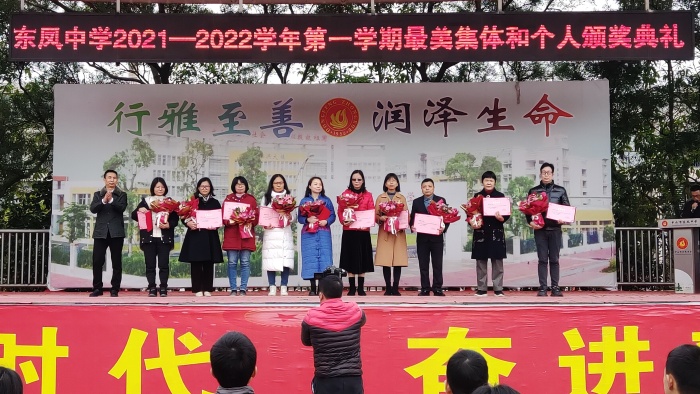 然后是“2021學年第一學期最美集體和個人頒獎”。在全校師生的共同努力下,在過去的學期里,東鳳中學取得了非常優異的成績。這些成績離不開老師們、備課組、年級的共同努力。東鳳中學為了樹立典型,表彰先進,評出了2021學年第一學期“最美年級、最美備課組、最美備課組長、最美教學能手、最美班主任”五個獎項。