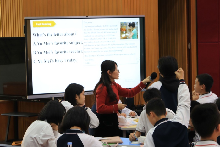 本次教研活動的第一個環(huán)節(jié),由梁穎老師進行示范課展示《跨教材教學擴展閱讀》。首先從人教版七年級上冊英語Unit 9的閱讀篇章引入,通過讀前導(dǎo)入,快速閱讀,掃讀細節(jié)等教學環(huán)節(jié),引導(dǎo)學生理解課本篇章的體裁、主旨和細節(jié)。在帶領(lǐng)學生通讀常規(guī)教材篇章后,在第二部分的教學環(huán)節(jié),梁老師選擇了一篇與內(nèi)容相近的國外教材語篇,通過視頻導(dǎo)入,讓學生通過閱讀文本理清文章的寫作順序。學生通過口頭報告等教學活動在合作與交流中對比國內(nèi)與國外的學校生活,認知由感性逐步發(fā)展到理性,合理地構(gòu)建英語思維能力,使得學生通過獨立思考、小組合作等各種方法探索,獲得新知,從而激發(fā)了學生的學習興趣。