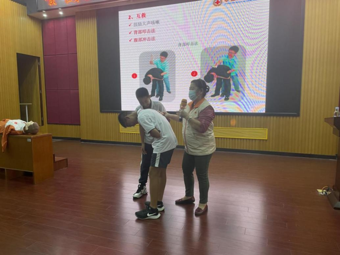 課堂上,高老師用淺顯的語言講述了:校園安全知識、防災避險緊急呼救、逃生技巧、心肺復蘇術、預防溺水知識、氣道異物梗塞處理、創傷急救(割傷、擦傷、扭傷 、鼻出血的止血處理、包扎)等生活中常見緊急情況的應急處理常識。并演示了心肺復蘇術、人工呼吸法等緊急救護技術。