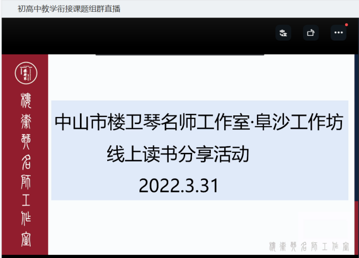 3月31日晚上,中山市樓衛(wèi)琴名師工作室·阜沙工作坊利用釘釘平臺(tái)開(kāi)展線上讀書(shū)分享活動(dòng),活動(dòng)由阜沙工作坊坊主暨市級(jí)立項(xiàng)課題負(fù)責(zé)人徐玲華老師主持。