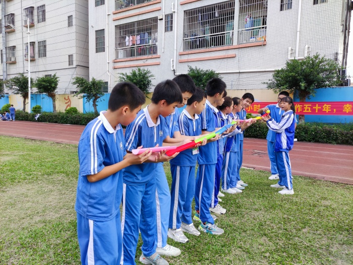 研討活動首先由課題主持人王武輝老師和課題組成員孫滔、朱四萍、陳浩芳、劉樂琴、鄭志權等五位老師圍繞“自由與規則”為主題開展德育拓展活動。他們主持的游戲分別為“桃花朵朵開”“珠行千里”“黑夜探索”。在每個游戲開展前導師都會詳細講解游戲規則。第一個游戲“桃花朵朵”,是一個熱身游戲,由陳浩芳老師主持。在陳老師的指導下,全班同學全身心投入,在操場上奔跑著、歡呼著、擁抱著,每一輪“落單”同學最后進行才藝展示,學生們的活動熱情得到激發。第二個游戲“珠行千里”,相對于第一個游戲,具有一定的難度,考驗小組同學的團結度,由鄭志權老師主持。在游戲分享環節,學生們躍躍欲試,并紛紛表示規則很重要,小組同學之間一定要團結。第三個游戲“黑夜探險”,這是三個游戲中難度系數最大,由王武輝老師主持。王老師在游戲開始前,給每一個學生分發一個眼罩,只有每組隊伍最后一位同學不用戴眼罩,整個游戲過程不能發出聲音,由導師帶領穿行預定的路線。游戲進行前,小組長組織本組同學商量指令動作,游戲結束后,進行游戲感受分享,在游戲中同學們感受到了小組同學規則、默契的重要性。