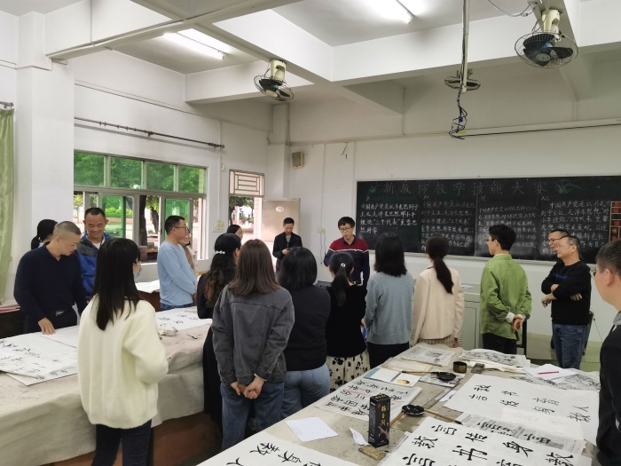 硬筆字、軟筆字、粉筆字是教師基本功之一。3月25日下午4點35分,港口中學近三年入職新教師“三筆字”技能比賽在學校書法室順利舉行。本次大賽由學校教務(wù)處、學校書法室聯(lián)合舉辦,大賽邀請到了吳可平、李超、林偉、何中慶、譚金華、梁用戰(zhàn)等老師擔任此次比賽的評委。十六位新教師,各展風采,共同為大家展示了一場書法藝術(shù)的魅力。大賽持續(xù)了近一個小時,采用現(xiàn)場書寫現(xiàn)場評分的方式進行,吸引了學校其他老師前來觀摩。