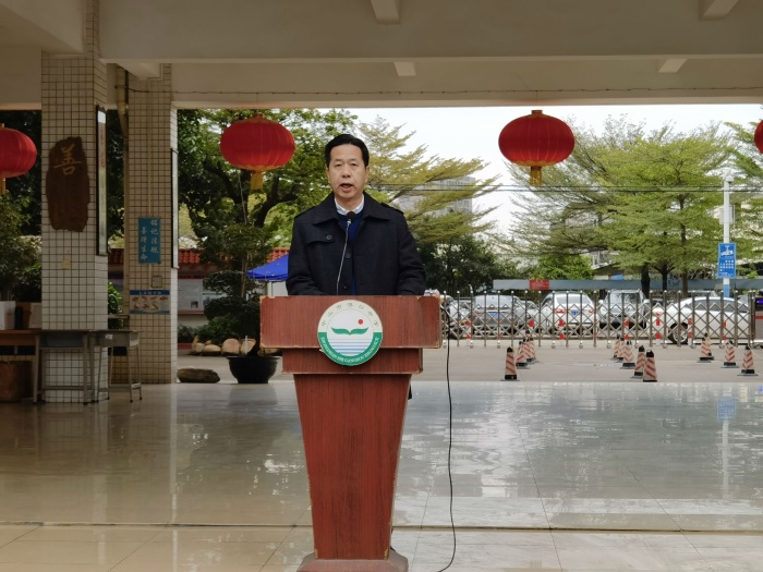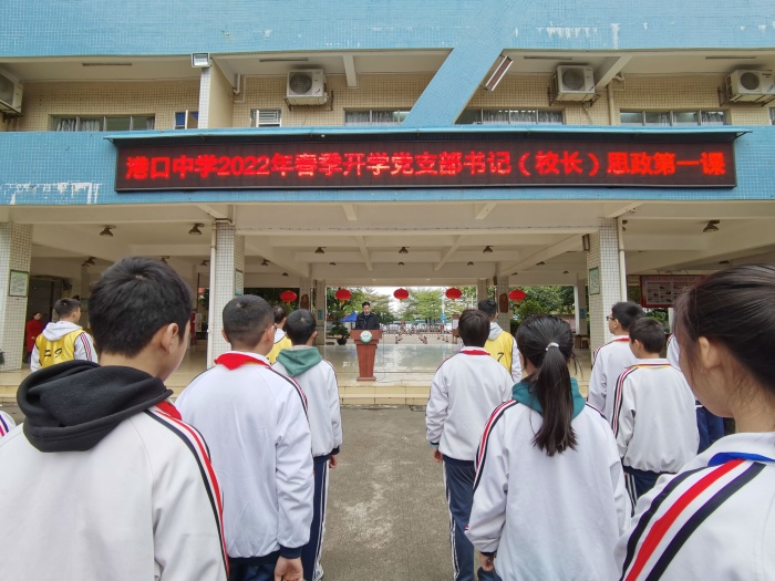 第一項,港口中學黨支部書記、校長廖志堅給全體同學上思政第一課,他給予全體師生新學期的誠摯問候,對全體同學提三點希望:一是目標決定結果,希望同學們樹立遠大的理想目標并為之不懈地努力;二是態度決定結果,希望同學們帶有使命感去學習,要有勤奮的態度、刻苦的態度、進取的態度、務實的態度;三是方法決定結果,希望同學們掌握科學、高效的學習方法,用努力和追求、用成功和輝煌去感動所有關心我們的人。