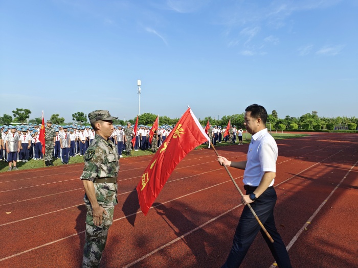 開(kāi)營(yíng)儀式上激動(dòng)人心的時(shí)刻就是授旗儀式的時(shí)候了。港口中學(xué)廖志堅(jiān)校長(zhǎng)為初一新生14個(gè)連授連旗。14位教官精神抖擻地接過(guò)連旗,挑起了國(guó)防訓(xùn)練的囑托和重任。