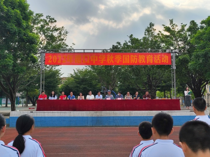 港口鎮武裝部賀洪彪部長、港口鎮教育和體育事務中心張育文主任、港口中學秦聲通校長、范泰昭副校長、張麗君副校長等領導以及初一初三級全體師生參與活動。本次國防教育活動由港口中學德育處組織籌劃,開營儀式由德育處副主任李莉主持。