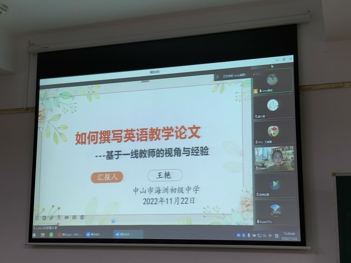為了促進中山市初中英語中心教研組成員的個人能力發(fā)展,打造教學(xué)、命題、研究“三?!比瞬?,使組員成為中山市初中英語教研的先行者,中山市初中英語教研員張?zhí)﹦偫蠋煕Q定,從11月開始,中心教研組每月第四周周二舉行面向不同鎮(zhèn)街初中英語老師的教研活動, 給中心組成員和各鎮(zhèn)街教師之間相互交流、相互學(xué)習(xí)搭建一個平臺,同時也希望通過中心教研組的活動輻射各鎮(zhèn)街的區(qū)域教研,打造中山初中英語教研的新范式。11月22日下午,港口鎮(zhèn)兩間中學(xué)——港口中學(xué)和大南中學(xué)的英語教師集中在各自學(xué)校的會議室,在線觀摩了中山市初中英語中心教研組組織的教研活動,本次活動的主題是教學(xué)論文的撰寫。