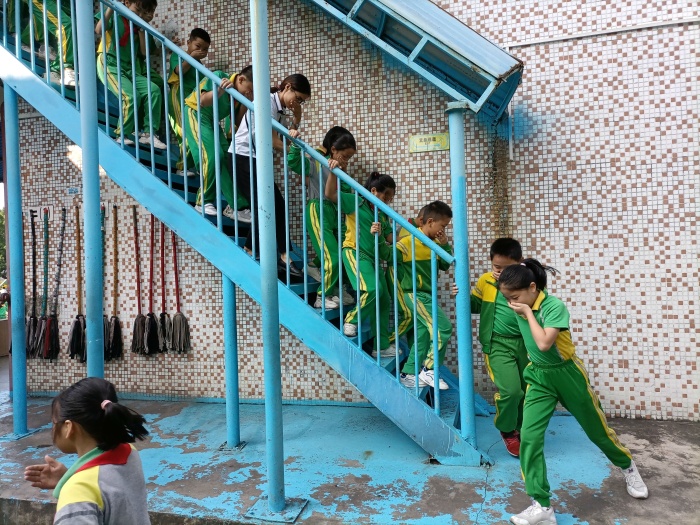 同學(xué)們在老師的指揮下,用手捂住口鼻、護(hù)頭、彎腰、雙肘撐開平放胸前保證呼吸暢順;按照疏散信號、疏散路線、疏散順序避難,不擁擠、不推搡、不彎腰拾物、更加不逆流行;若有人摔倒時,要馬上停下并大聲呼救,告訴后面不要向前,自己摔倒時要盡快爬起;同學(xué)們迅速有秩序,一個接著一個快速安全撤離到集合點后并蹲下,同時兩手十指交叉相扣護(hù)住后腦和頸部。老師到達(dá)集合點后,立刻清點人數(shù)并向總指揮報告。