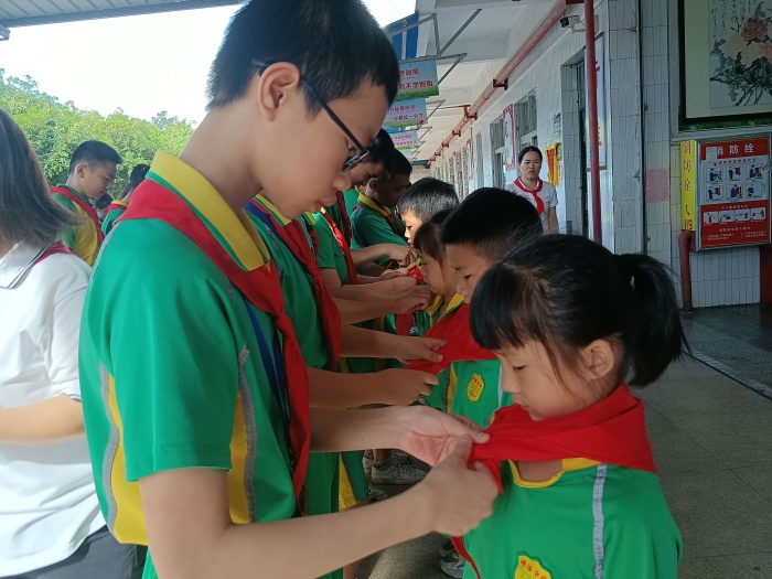 一年級的小朋友光榮的入隊了。大隊輔導員吳曉燕宣讀新隊員名單。高年級的少先隊員為新隊員佩戴紅領巾。看!為小朋友們戴上紅領巾的中隊輔導員和老隊員們是不是特別認真呢!