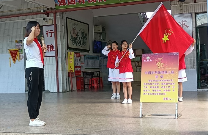 當鮮艷的紅領巾在胸前迎風飄揚時,少先隊員們倍感自豪。面對著入隊誓詞,少先隊員們在大隊輔導員吳曉燕地帶領下莊嚴宣誓。洪亮的呼號聲傳遞出小隊員們激動、自豪的心情。緊接著,德育主任陳金祥為各中隊授旗;隨后,德育校長鄧韶洲宣布新成立中隊及頒發中隊聘書。