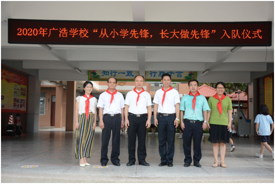 隊旗飄飄,星星火炬閃耀,為慶祝“六一”兒童節,2020年5月29日早上,中山市廣浩學校少先大隊部組織一年級學生舉行隆重的“從小學先鋒,長大做先鋒”主題入隊儀式。廣浩學校黨支部書記楊善德、少工委主任黃飛躍、德育處許向陽主任、梁超勝主任、團委莫欣老師、少先大隊輔導員陳燕坪老師出席了入隊儀式。