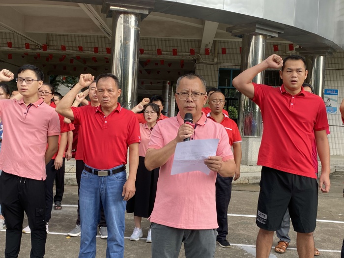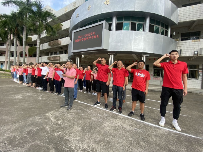 接著,吳平老師帶領全體教師宣誓。新的學期,海洲中學全體老師將繼續秉持立德樹人、無私奉獻的精神品質,為人師表、關心學生,鑄造海中更美好的明天。而后,是學生代表發言,三4班李凱琳同學代表初三學子,道出新學期的奮斗目標,激勵全體海中學子排除萬難,奮勇爭先。