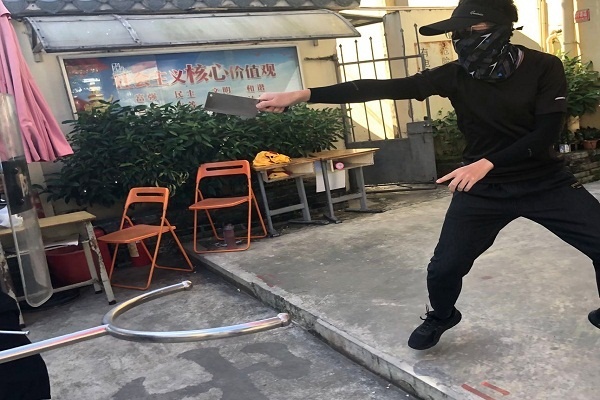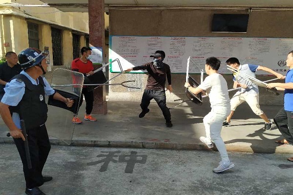 本次模擬場景:清晨,學生上完早讀課后,正三三兩兩地走出課室的時候,一名蒙面的持刀歹徒突然闖進校園。學校立即啟動安全預防校園暴力事件應急預案,學校德育處郝利娟主任播放警情通知:“有歹徒闖入校園,同學們快速到安全地方!全體老師快速到班級!” 安全組一名老師打電話報警,在學校附近的巡警火速趕到了現場。學校保安室三名保安人員立即持鋼叉和盾牌,老師們則有的持長棍,有的隨手抓起板凳、鐵鍬等工具上前驅趕,在警察的配合下,大家一起將暴徒制服,最后警察將暴徒緝拿帶走。