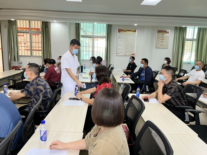 會議的第一項議程進行了家長防控演練。下午4:10,由分管領導和校醫梁程智組織到會家長在綜合樓二樓黨員活動室進行防控演練,演練內容包括測體溫、查驗核酸、健康碼和行程卡等,同時明確體溫超過37.3的處置流程。