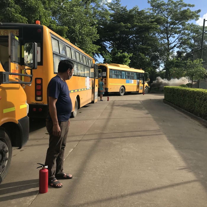 隨后,演練正式開始,事先準備在校道上的煙霧彈一一被引燃,很快,十臺校車都浸在滾滾濃煙之中,當校車都到達預定地點時,校車司機與隨車老師互相配合,組織學生有序地從前門及安全門分頭撤離校車,并按照既定路線疏散到安全地帶。接著,隨車老師迅速清點乘車學生的人數,確保每個學生都安全撤離,不遺漏一人。最后,葉寶山主任對此次演練進行了點評,對同學們的認真、嚴肅對待演練的態度和表現表示了肯定。